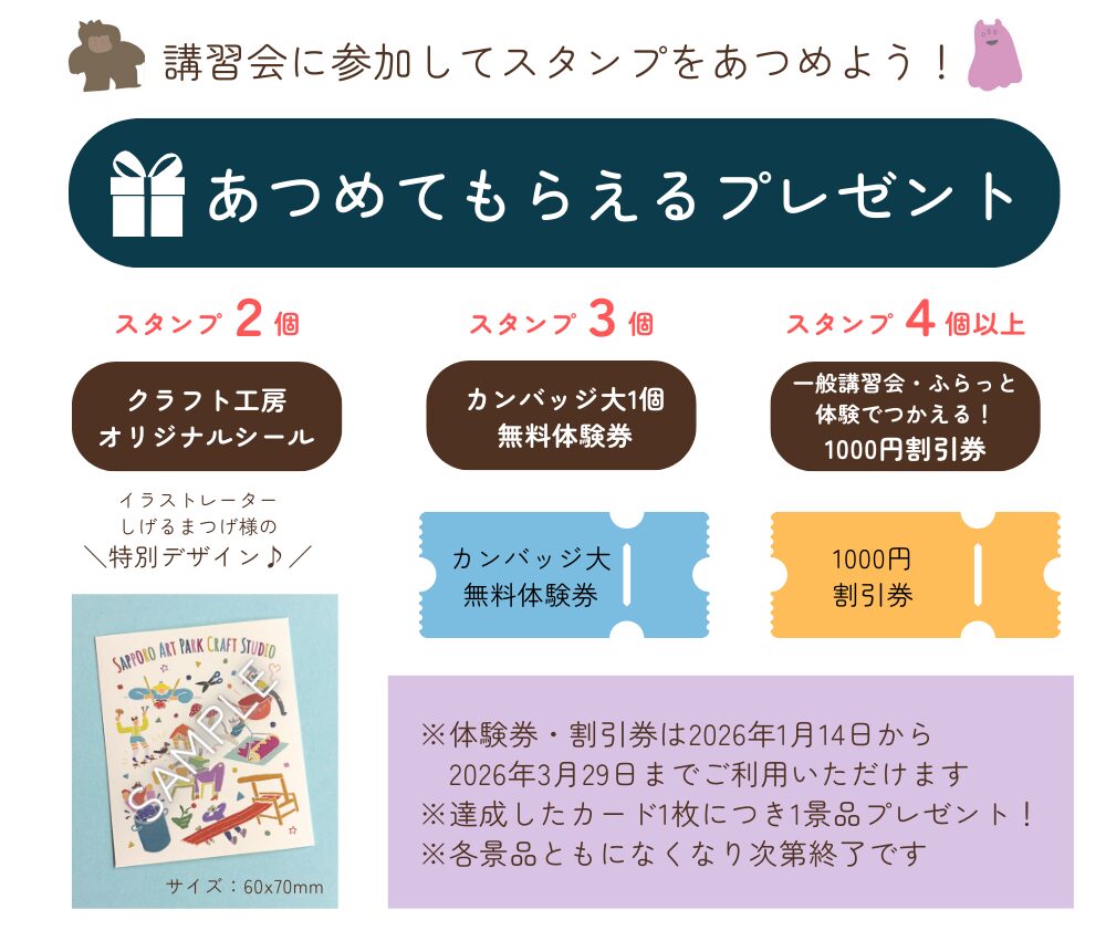 ③スタンプ4個以上達成:「一般講習会」「ふらっとクラフト体験」で使える1,000円割引券1枚(スタンプラリー記載の講習会には使用不可)