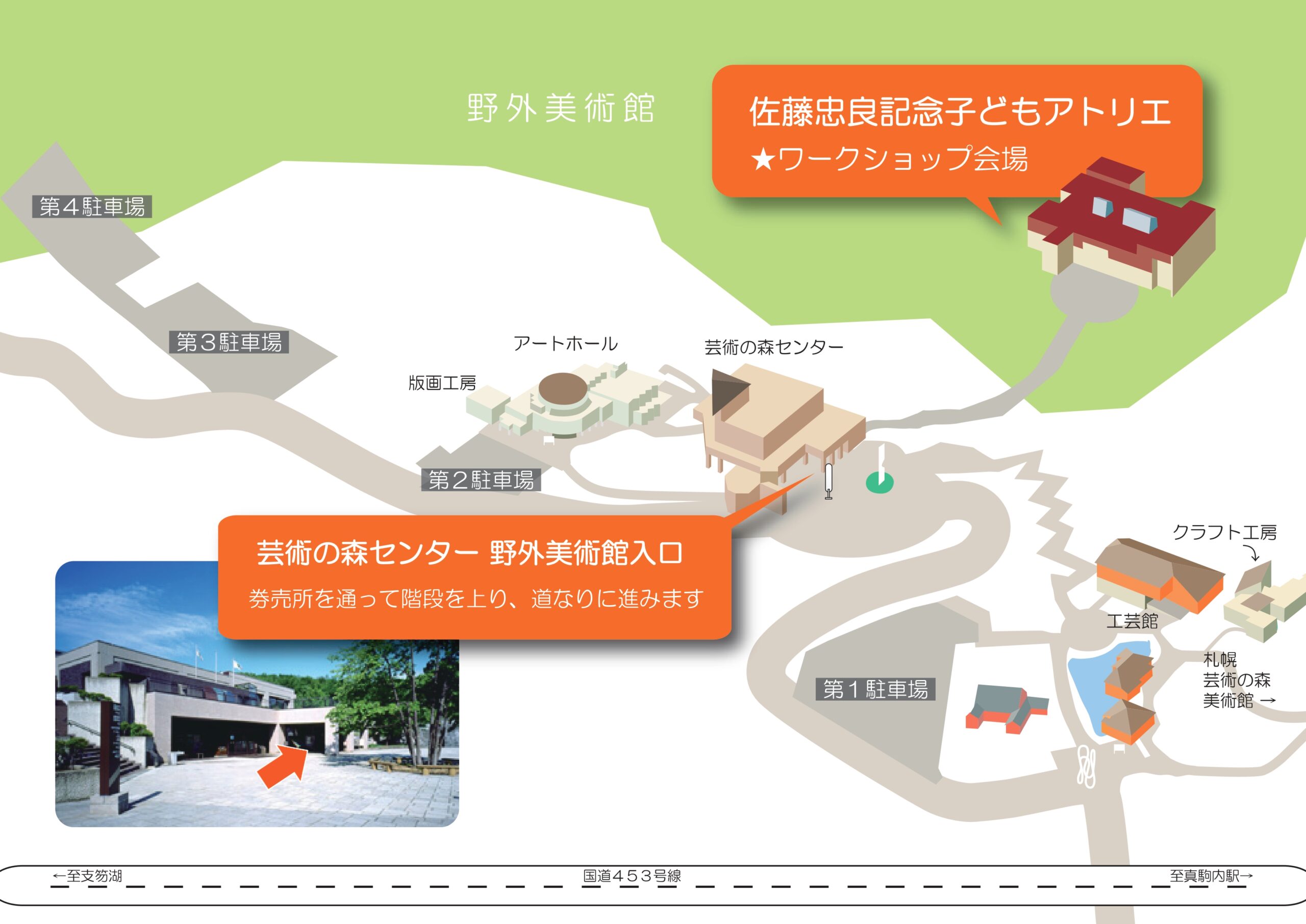 子どもアトリエは野外美術館内にあります。一番近い駐車場は第2駐車場です。
